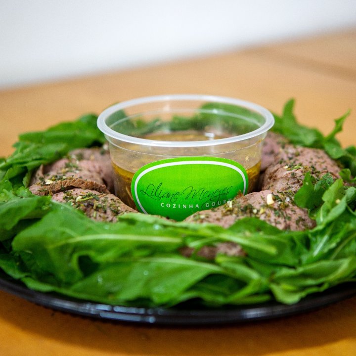 Bandeja de rosbife frio ao molho pesto.