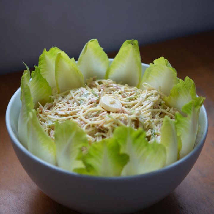 Fios de batata, peru defumado, aipo, maçã verde e palmito.