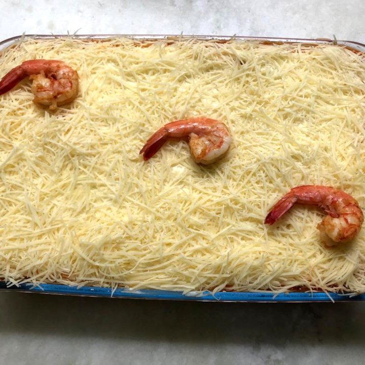 camarões e cobertura de queijo.