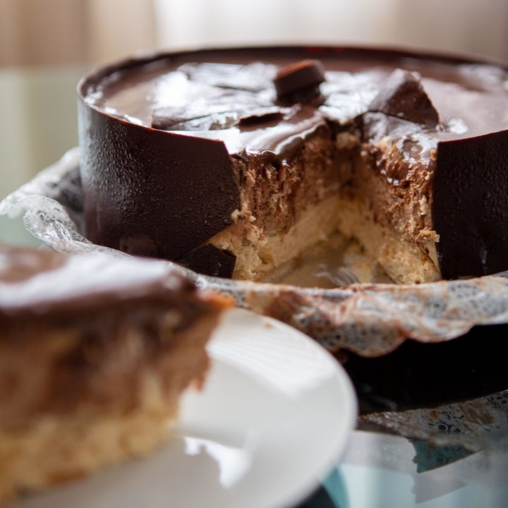 Base creme de leite, intercalada com biscoitos e cobertura de chocolate